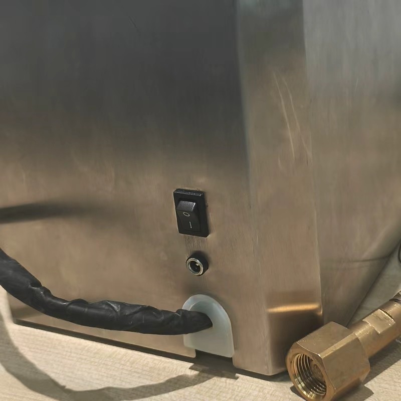 The MLP-05 Hand Held Glass Froster is a compact stainless steel machine designed for rapid cup cooling in commercial settings. It uses pressurized carbon dioxide released through a precision metal nozzle to create a dense frost layer inside glassware within seconds. The square stainless steel housing ensures structural stability and durability during continuous high-frequency operations. Its small 195-millimeter footprint allows placement on crowded counters while delivering a fast visual effect that enhances beverage presentation. The froster is engineered for bartenders, cafés, and premium hospitality venues seeking faster workflow and visually appealing drinks. Users experience an immediate cooling effect, improved drink taste stability, and a clean, crisp layer of frost that elevates the customer experience.