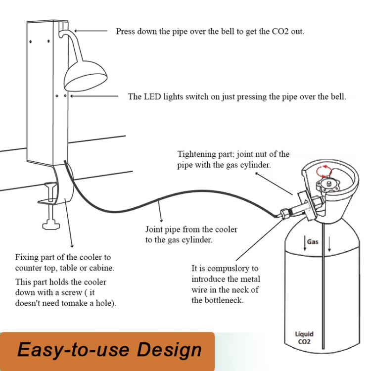 An Instant Glass Froster is a compact bar-mounted or wall-mounted beverage preparation device designed to instantly chill and frost the inner surface of drinking glasses using pressurized CO₂. From the user experience perspective, it focuses on speed, visual impact, and operational simplicity rather than complex controls. During use, the operator simply presses the glass downward over the frosting bell, triggering a rapid release of cold CO₂ that creates a uniform frost layer inside the glass within seconds.